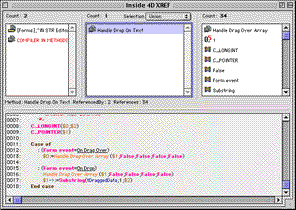XRef window is similar to the 4D Insider window. If object in central pane is selected, the left window displays objects that use this object and the right pane displays objects which are used by this object.